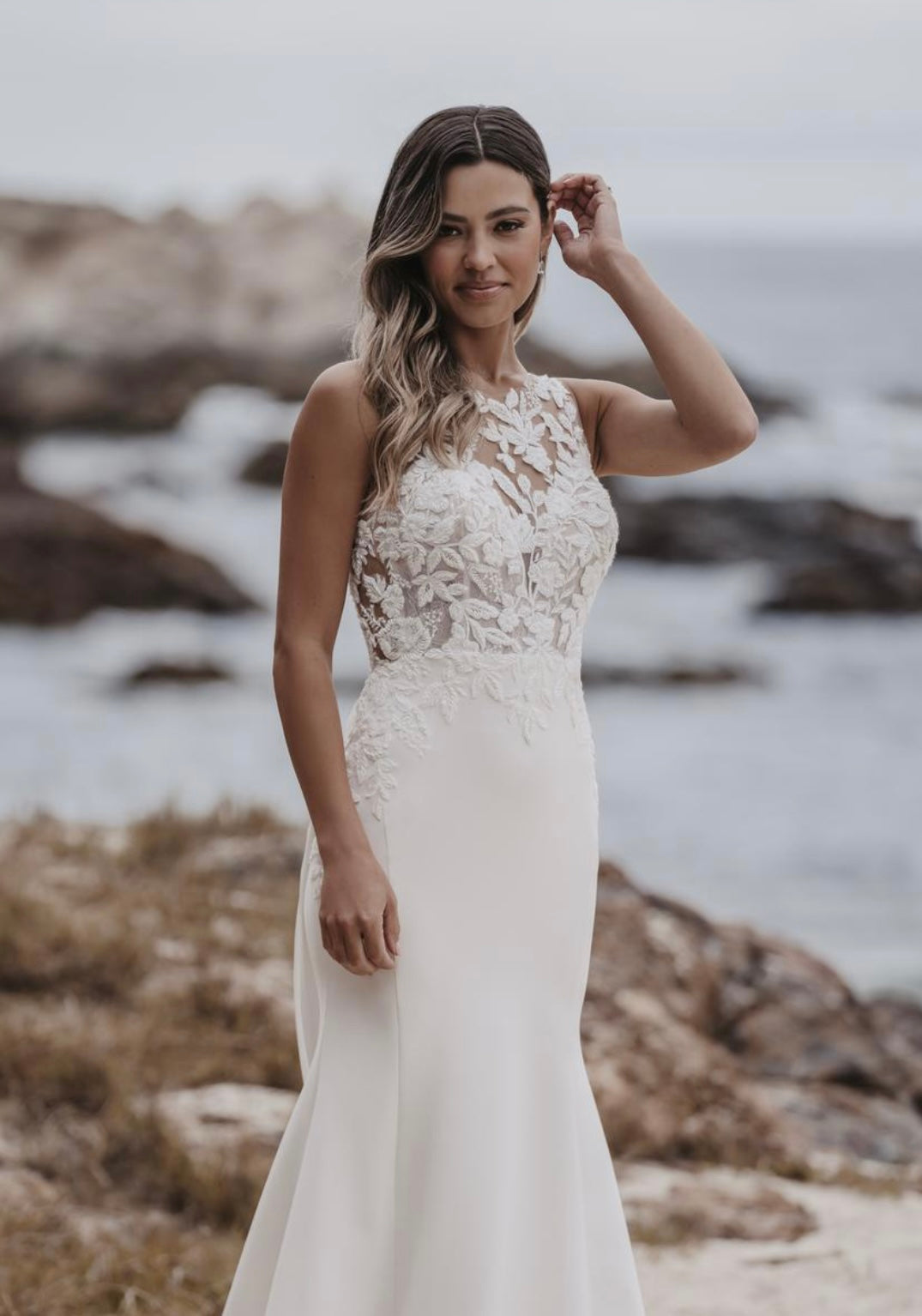 Stunning gown ‘9905’ by Allure Bridal. Featuring an open back with a dramatic plunge bodice & a high neck overlay of appliqué lace. A simple stretch crepe skirt completes the look. Designer sample dress in a UK 14-16 at a fraction of original RRP.