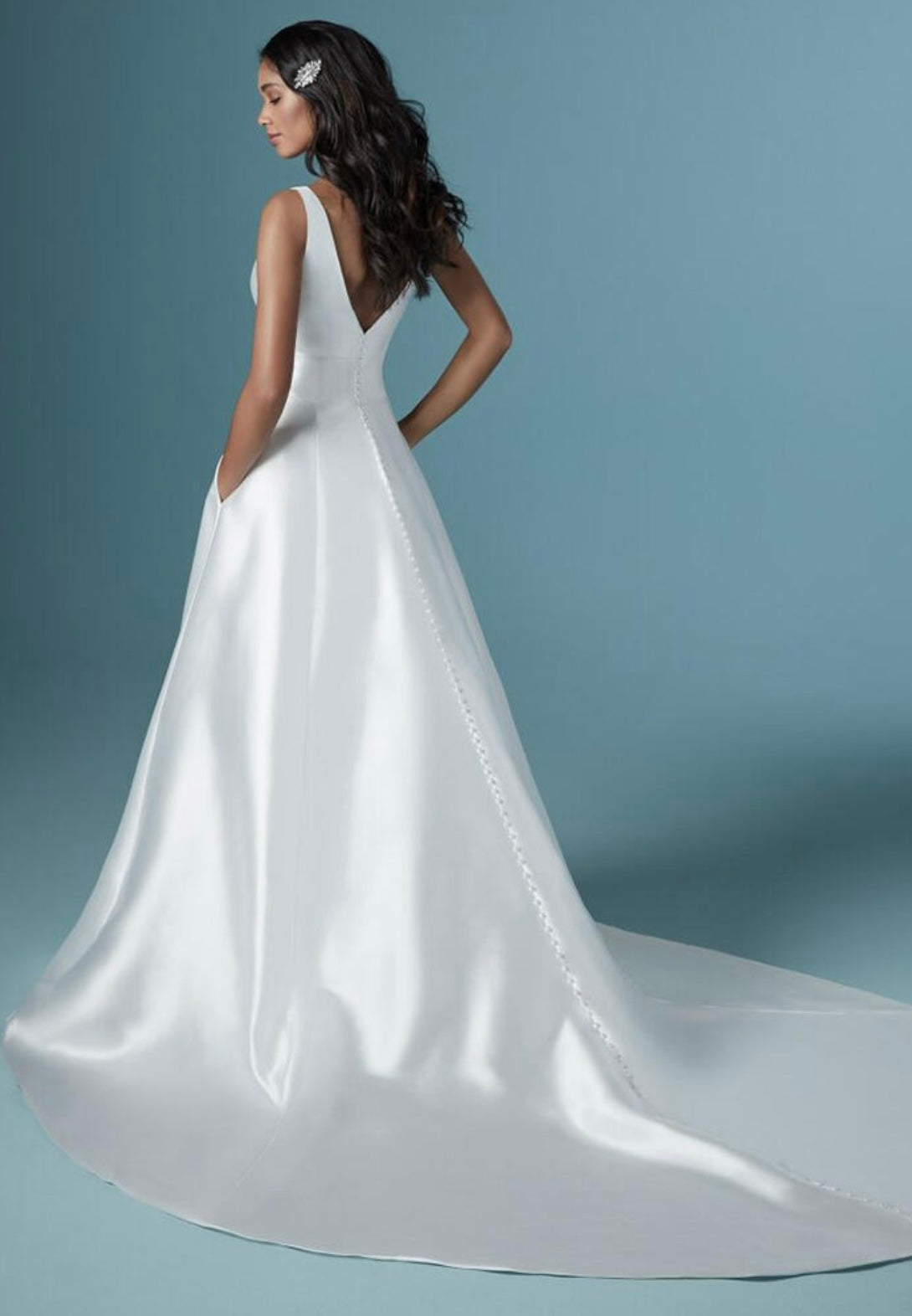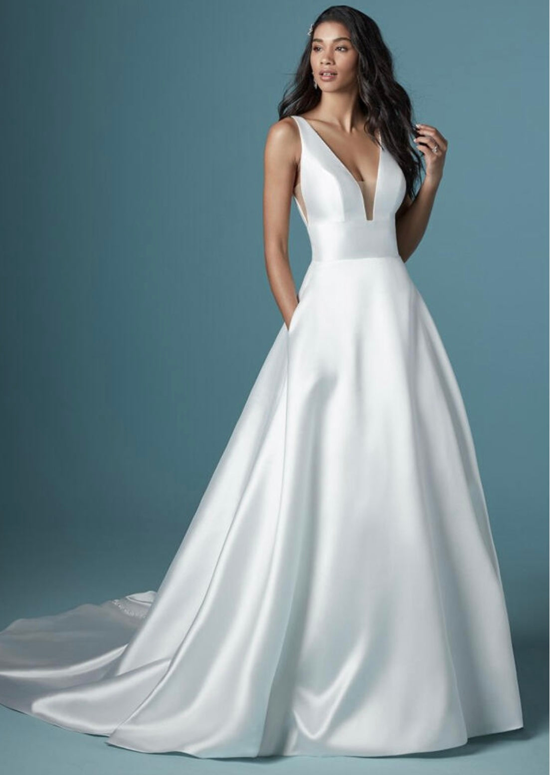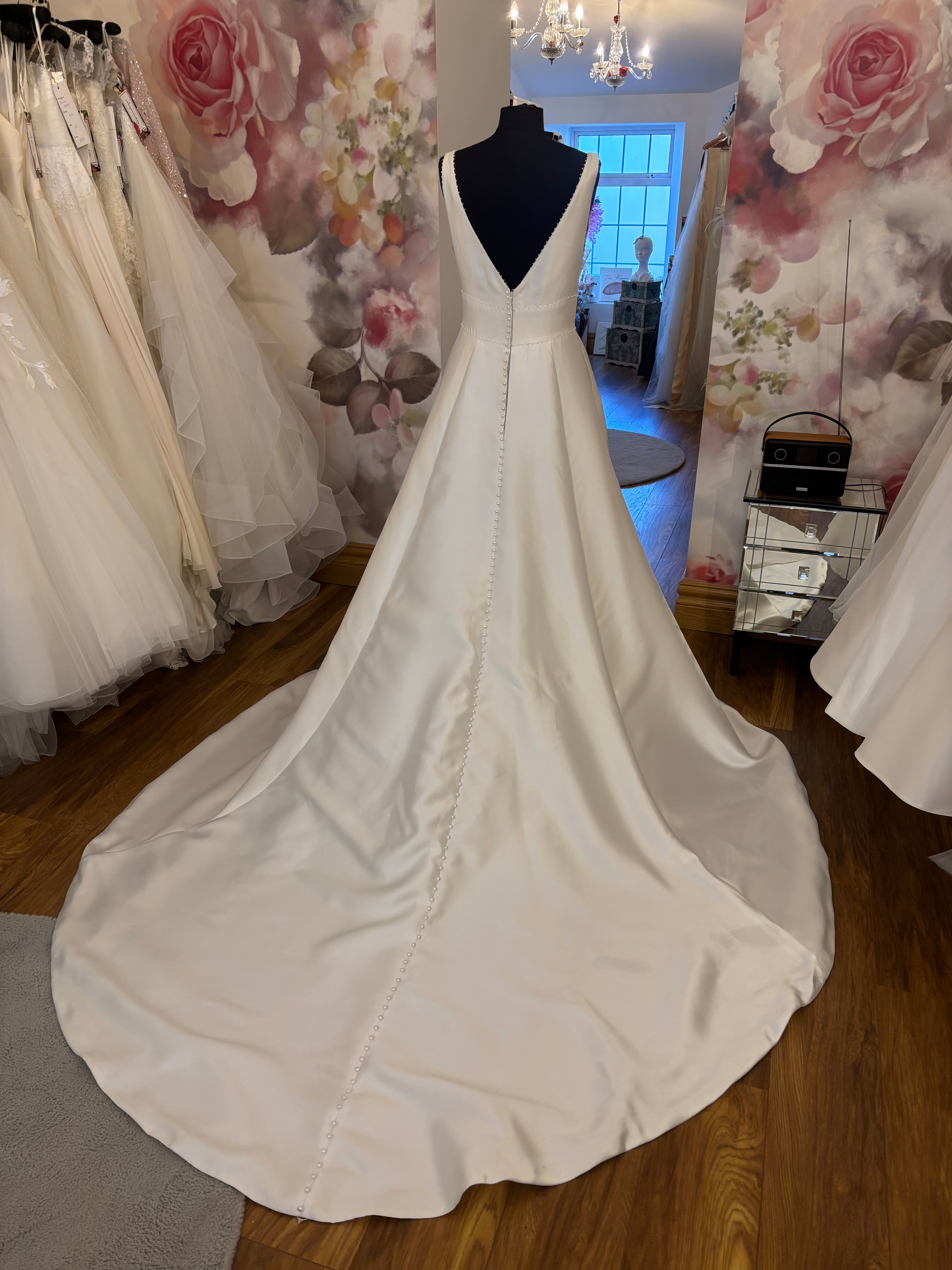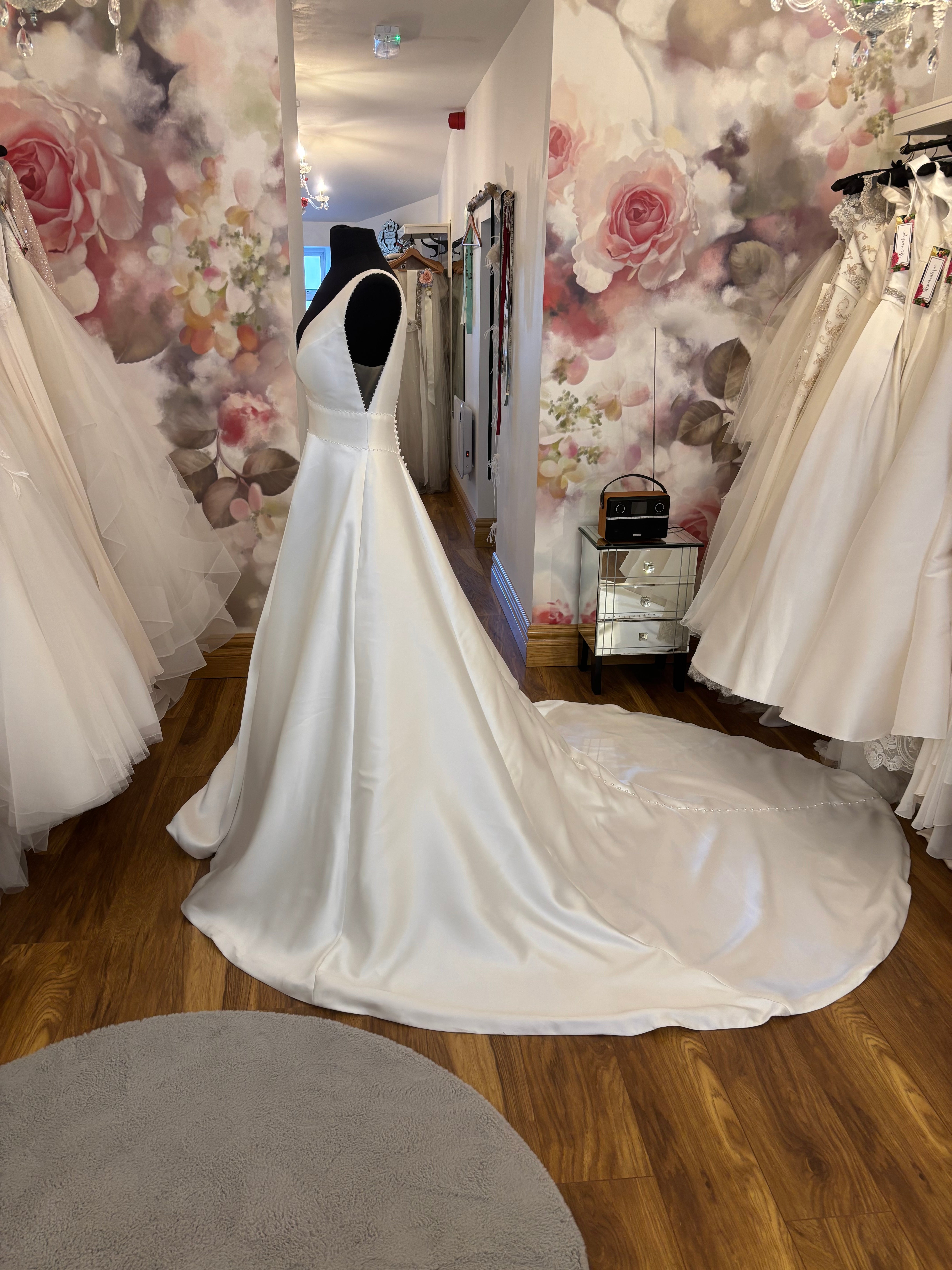 Classic & crisp mikado gown ‘Raven’ by Maggie Sottero. Featuring a plunge V neckline with delicious pearl beaded trim. A defined waist leading into a full skirt with pockets!! Ex sample in ivory colour in a UK 14 in good condition. Available at a fraction of original RRP €2000 now €795 !!