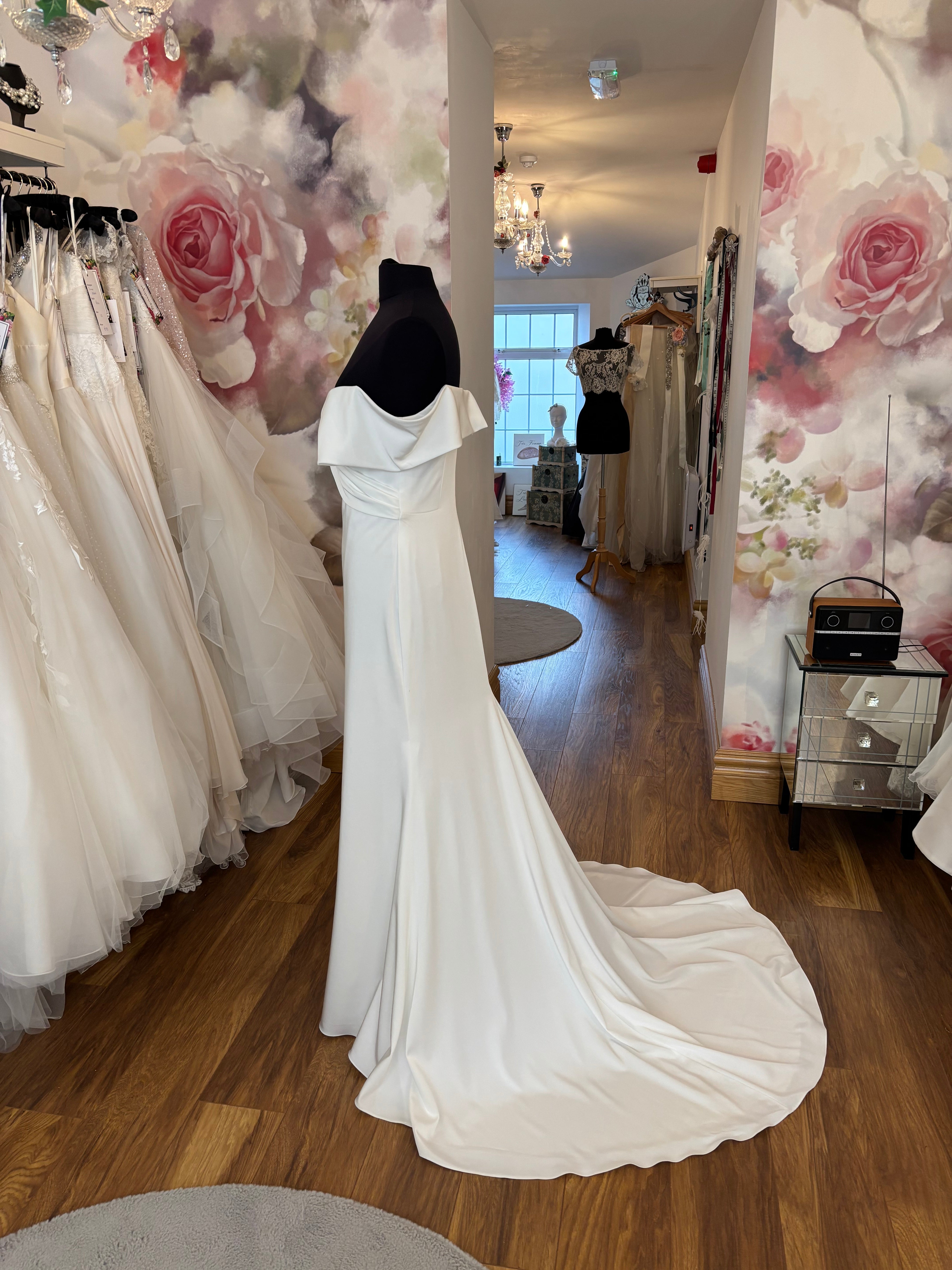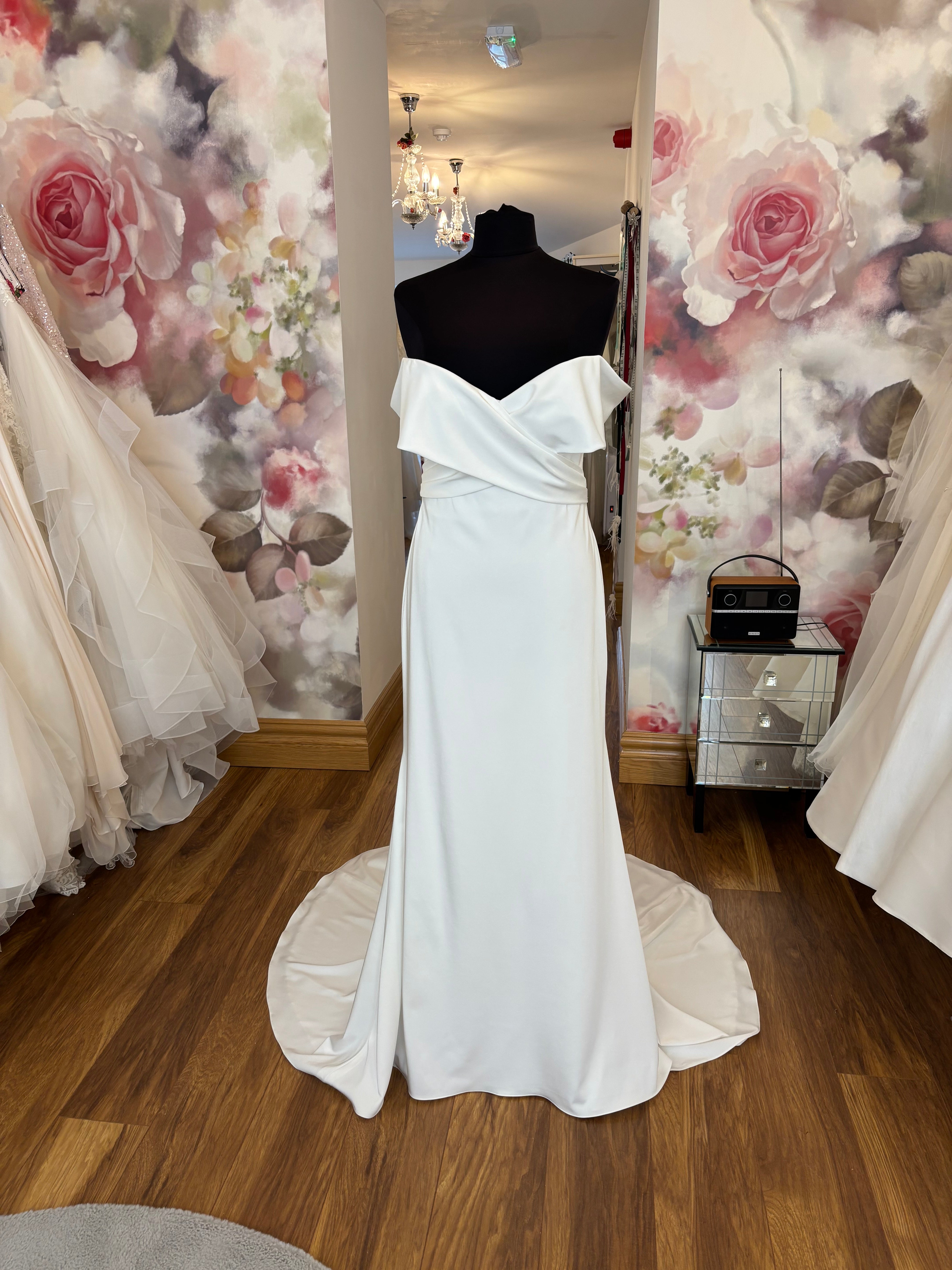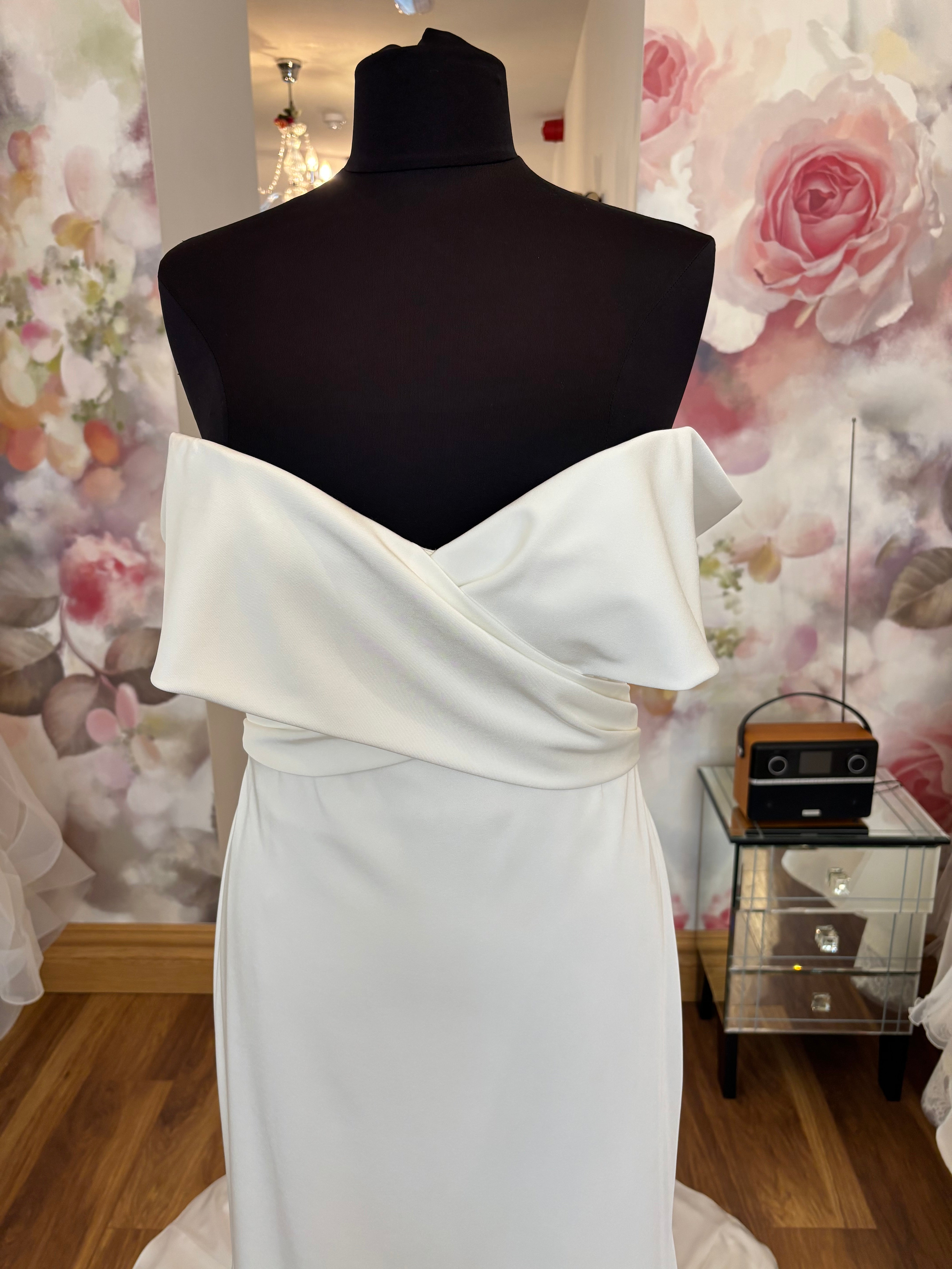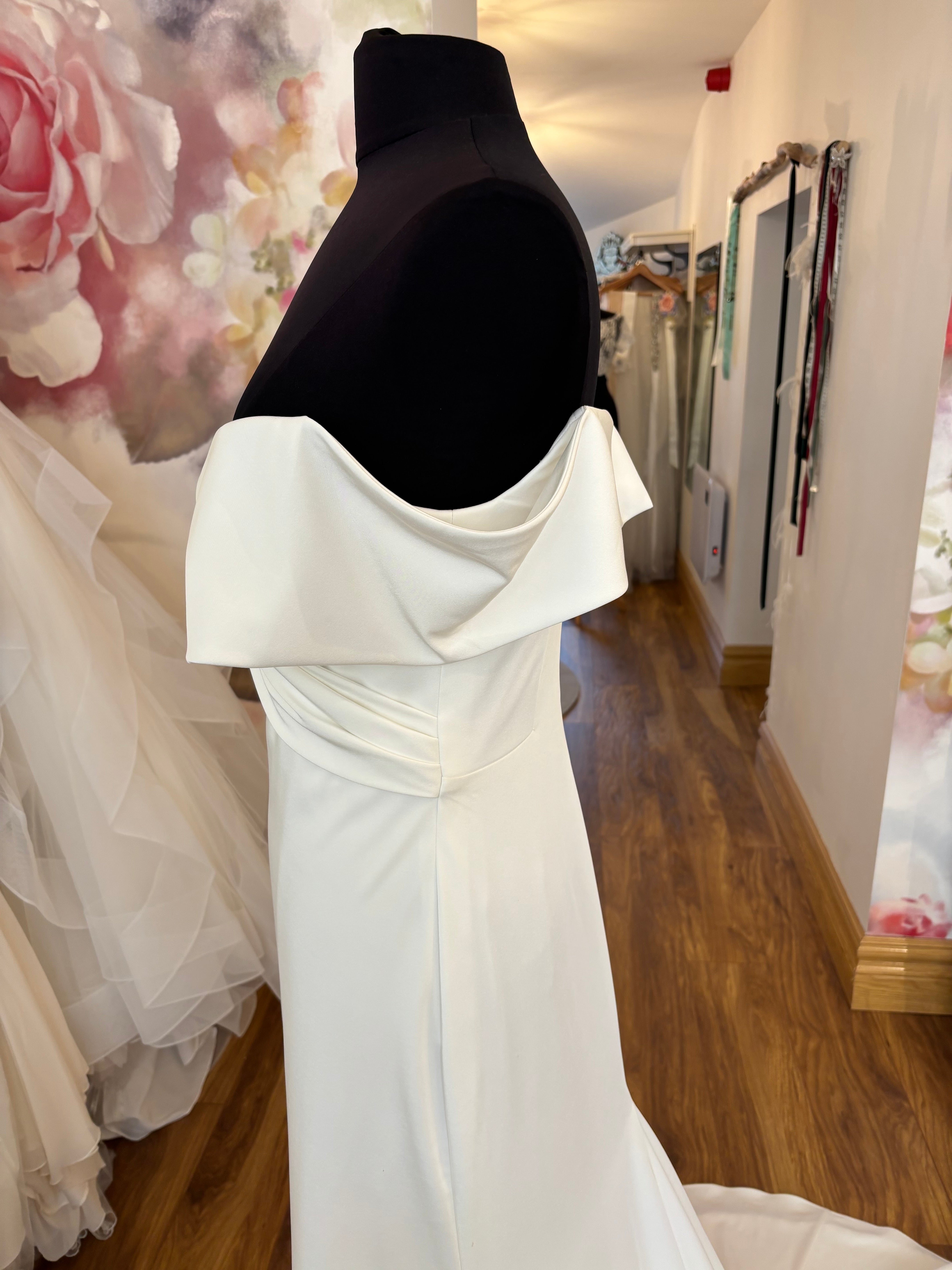 Simple & sophisticated crepe gown Ellison by Mia Mia Bridal. Featuring an off the shoulder design, a rouched bodice & fitted skirt. Perfect for the bride looking for an elegant gown with a twist. Ex display sample in great condition. RRP €1895 now €895 so super saving s on this gown as always at Rosemantique.