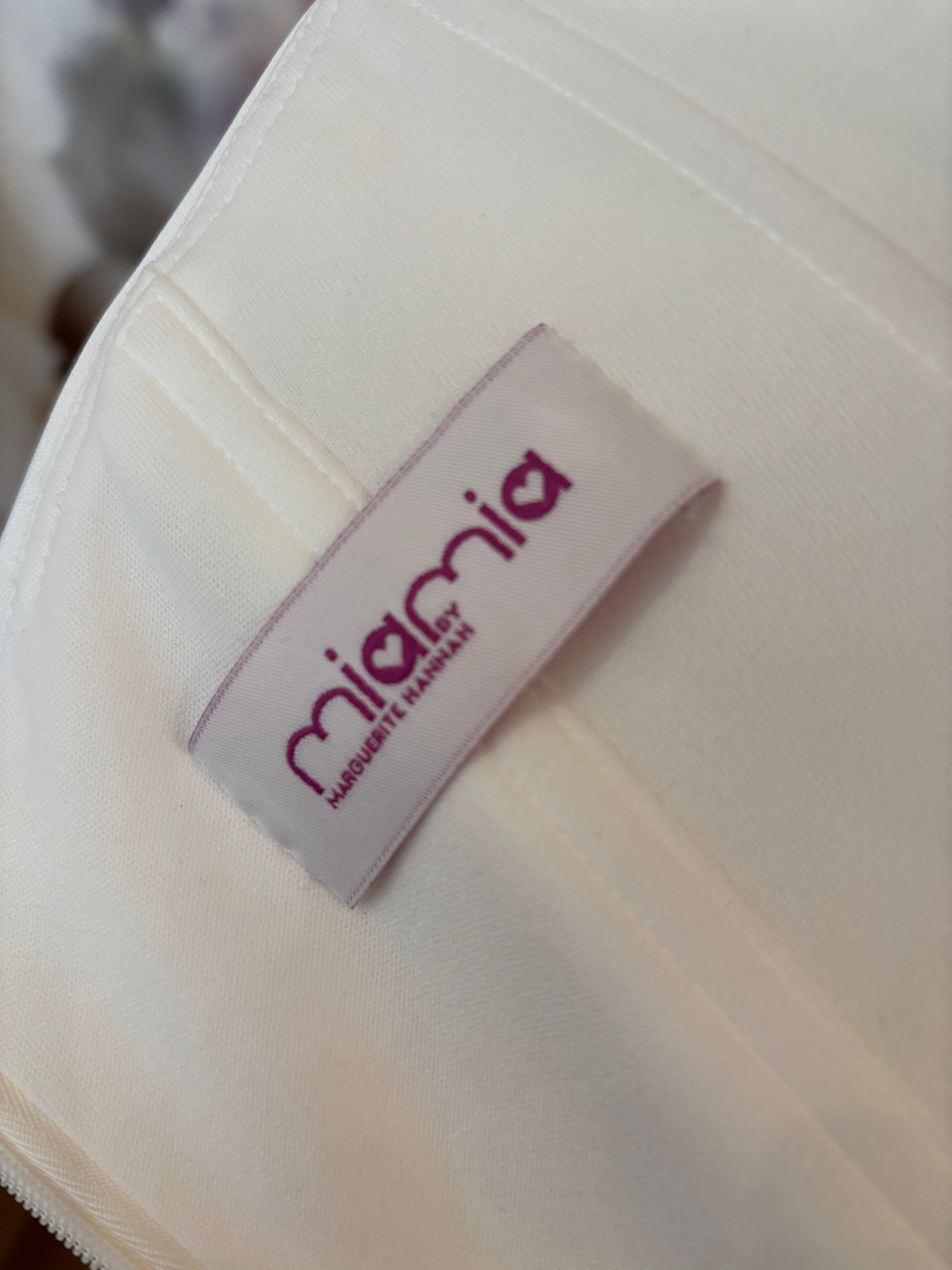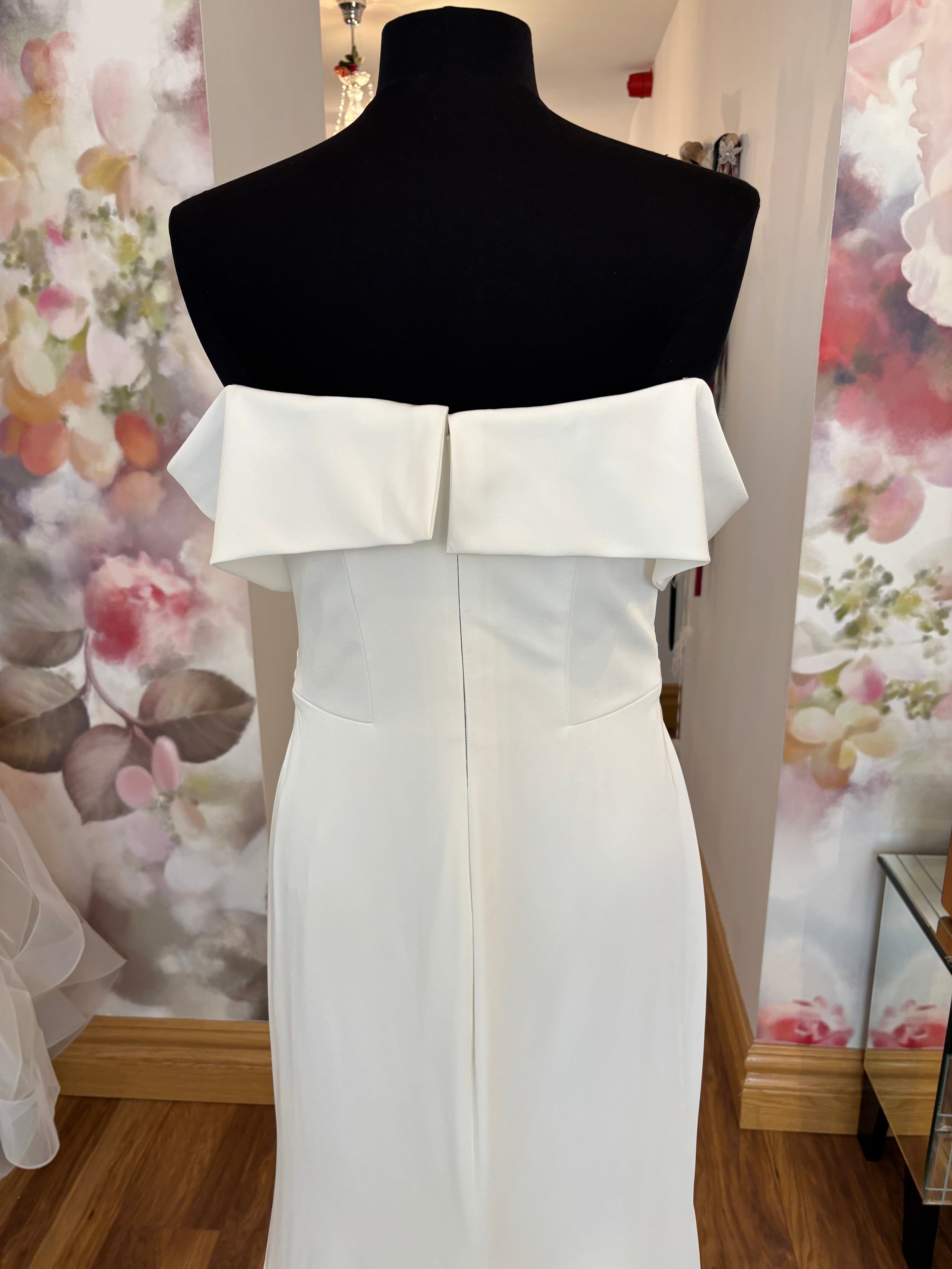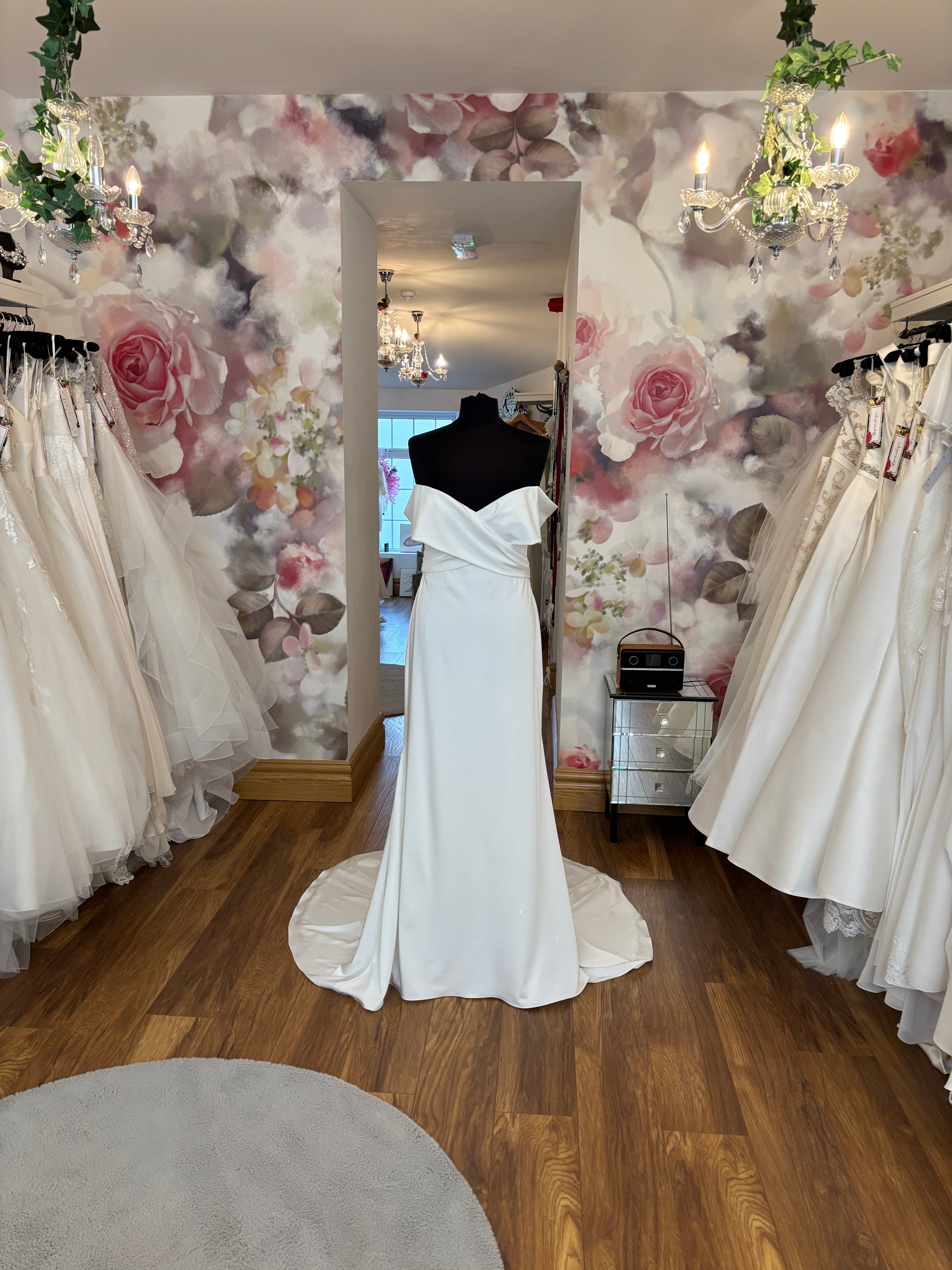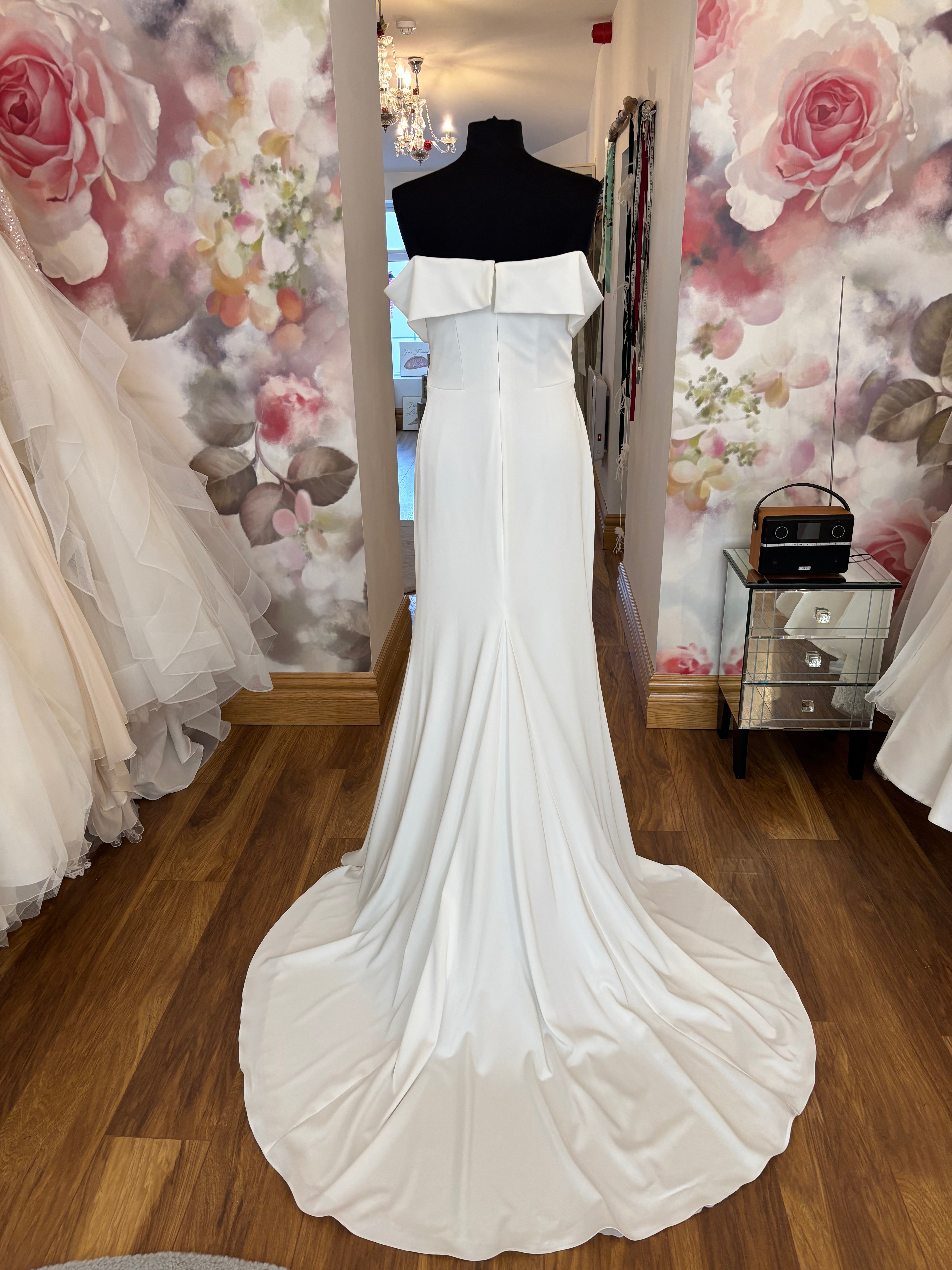 Simple & sophisticated crepe gown Ellison by Mia Mia Bridal. Featuring an off the shoulder design, a rouched bodice & fitted skirt. Perfect for the bride looking for an elegant gown with a twist. Ex display sample in great condition. RRP €1895 now €895 so super saving s on this gown as always at Rosemantique.