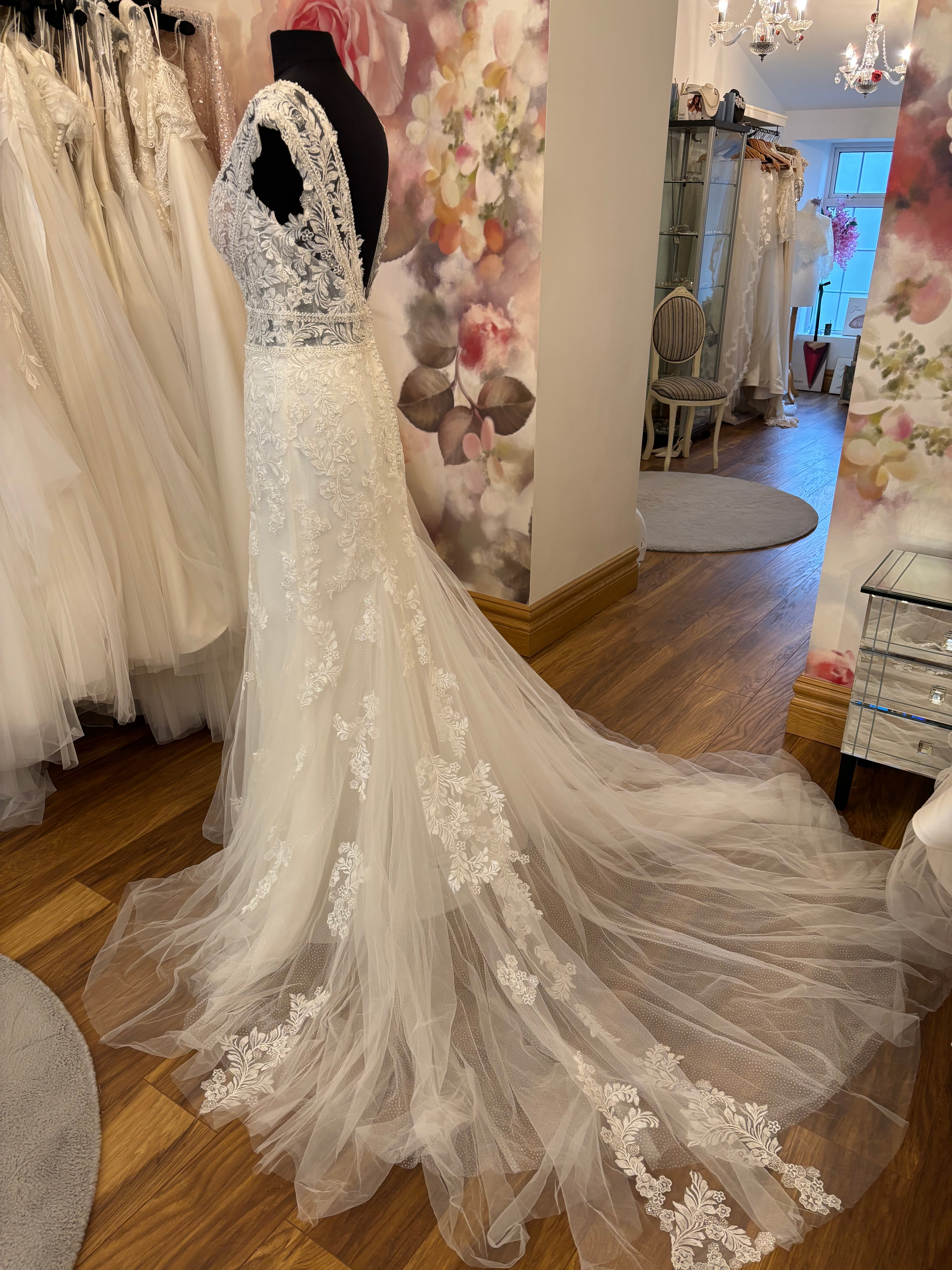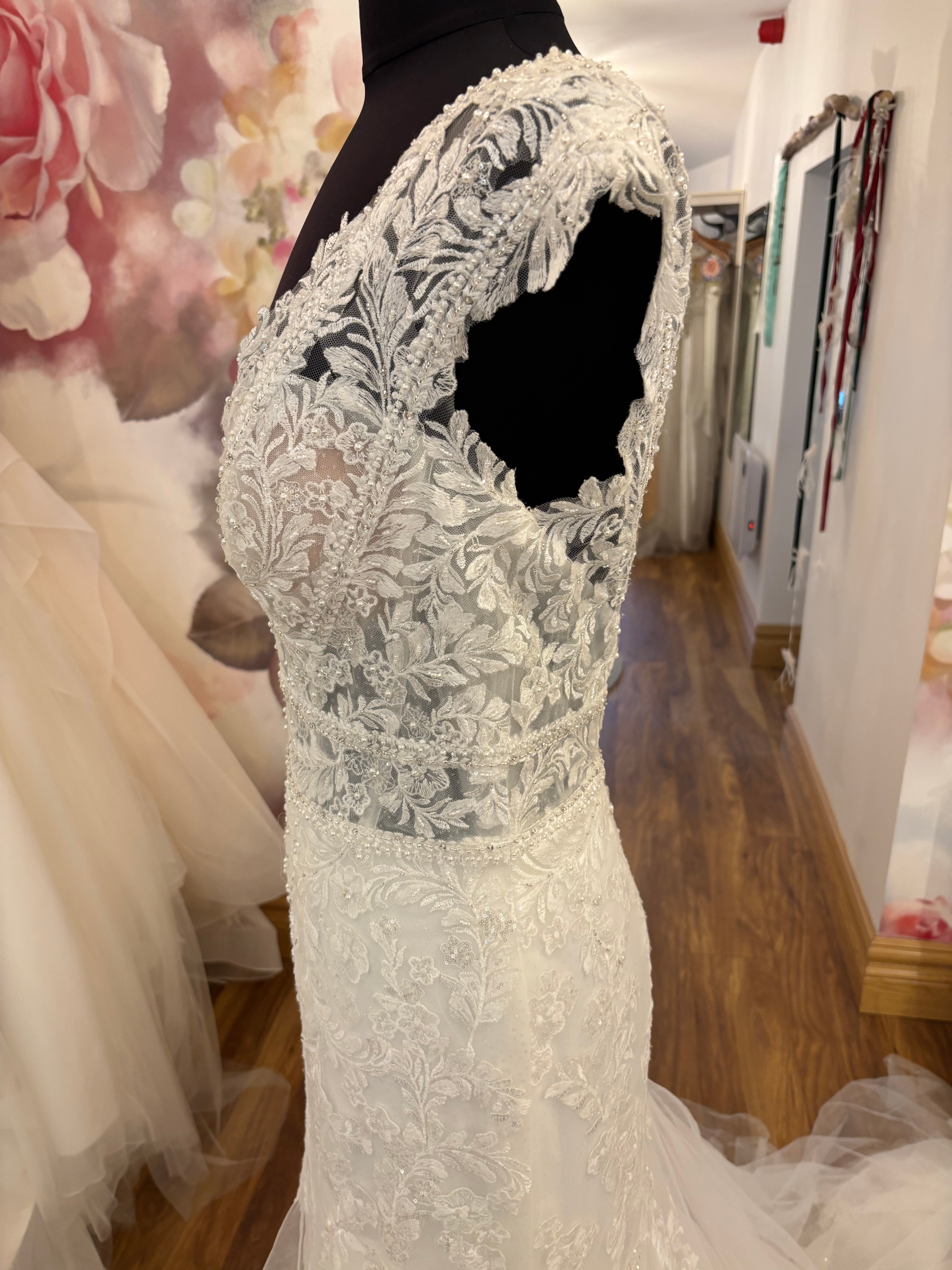 Stunning beaded lace gown ‘22513’ by Elia Moreni for Tres Chic. Plunge neckline with cap sleeves. Fully beaded with delicate shimmering crystals. Beautifully defined at the waist. A fit & flare skirt & sweeping train completes the look. Ex display model in great condition, ivory colour UK 16. RRP €2200 now €895 !!